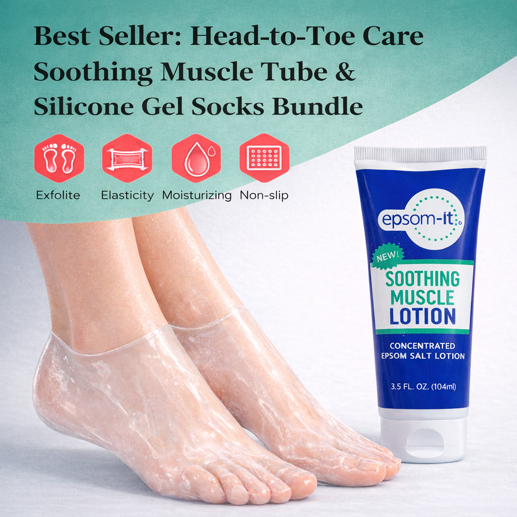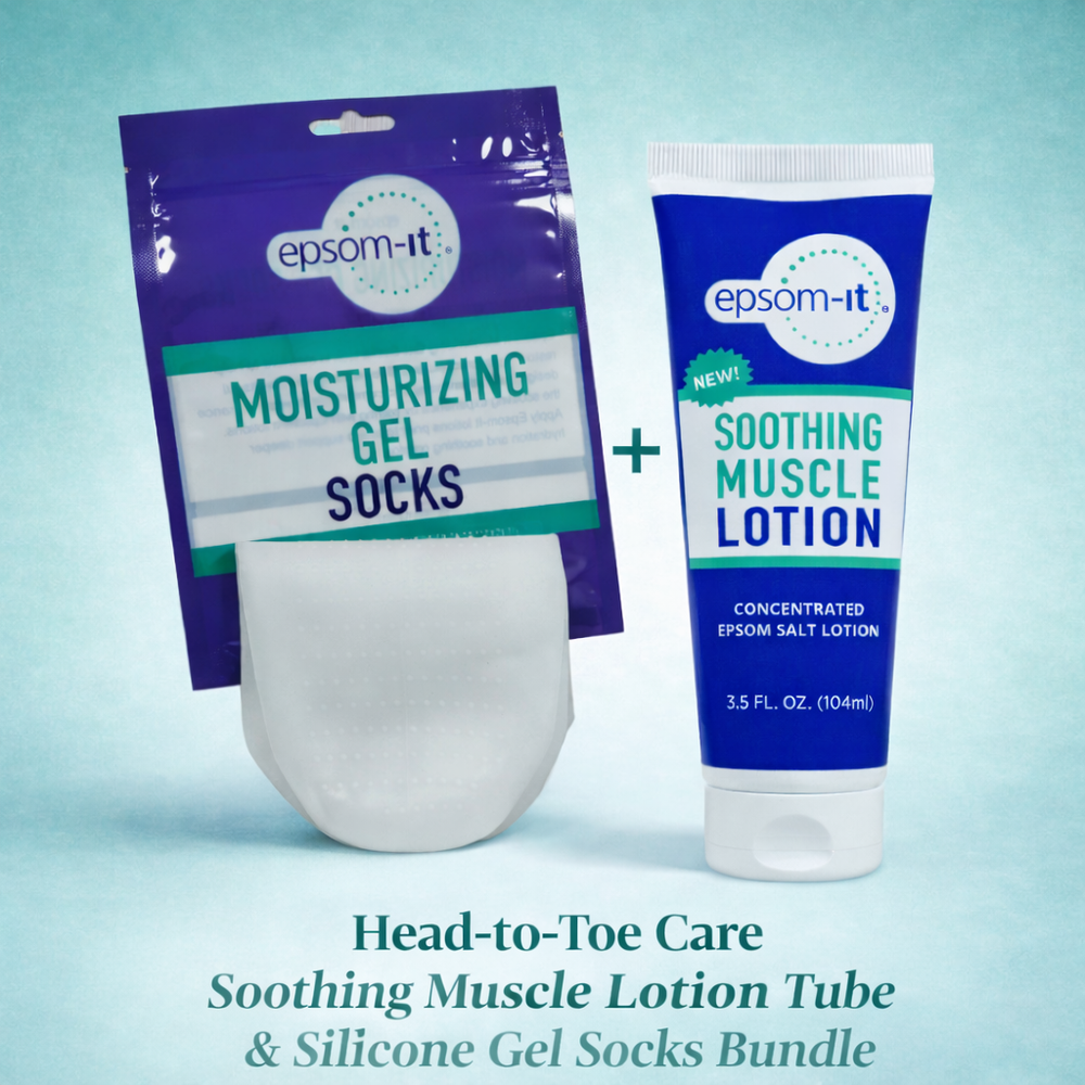 Unwrap head-to-toe comfort this season with the Epsom-It Soothing Muscle Tube & Silicone Gel Sock Duo, a focused bundle featuring our Soothing Muscle Lotion Tube (3.5 oz.) and moisture-locking silicone gel socks. Together, they bring the wellness of Epsom Salt and magnesium directly to skin and feet in an easy, at-home routine designed for lasting comfort and recovery—no tub, no soak required.