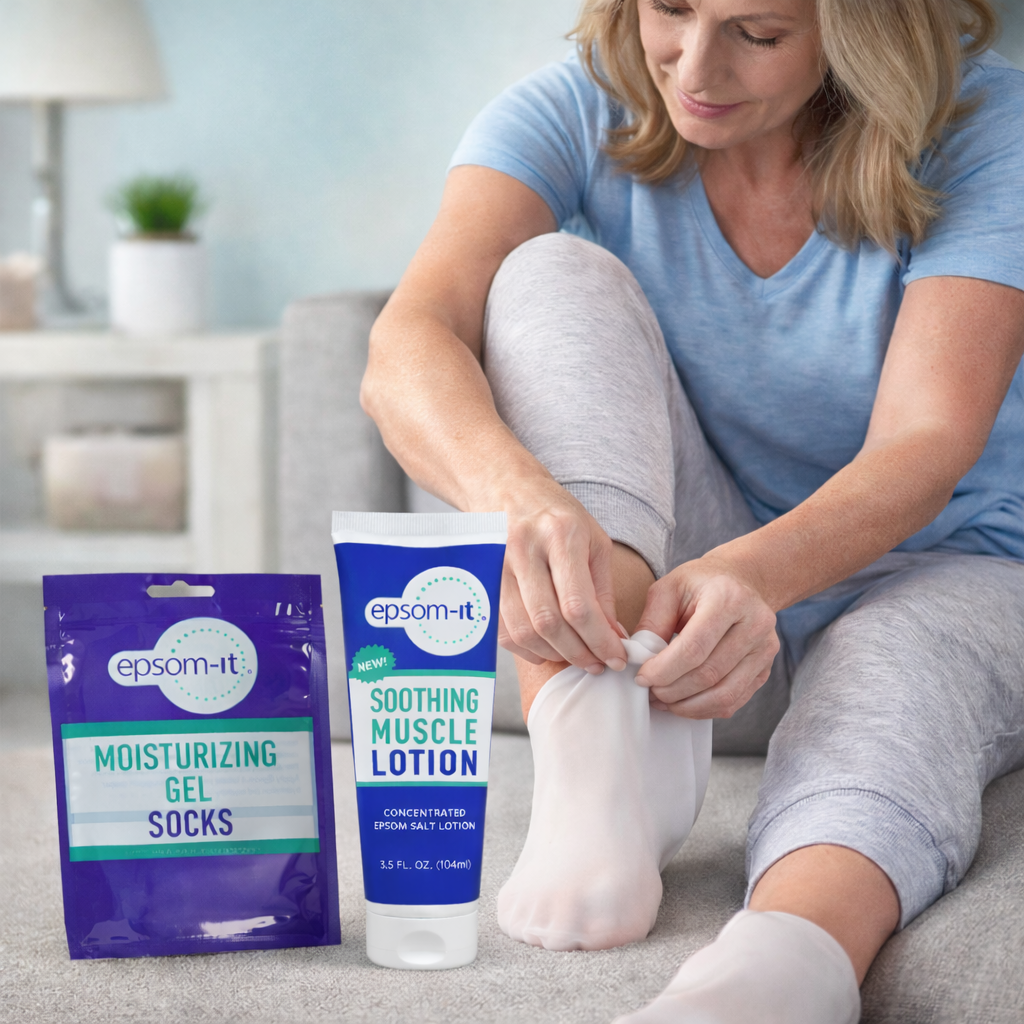 - For best results, generously apply and massage Epsom-It products into targeted areas to promote comfort and relieve foot discomfort or squeeze Epsom-It products directly into the Epsom-It silicone gel socks before putting on the socks to help enhance absorption, boost softness, and leave feet feeling more relaxed and refreshed after daily activity.